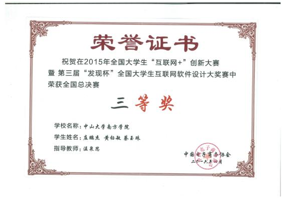 第三届“发现杯”全国大学生互联网软件设计大奖赛于2016年4月9日在杭州落下帷幕,我院学子庄鹏杰、黄钰敏、蔡玉珠在温泉思老师的指导下荣获全国总决赛三等奖。 大赛于2015年8月正式启动,全国五大赛区共有787个团队提交参赛作品。...