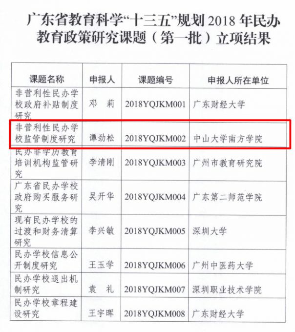 近日,广东省教育厅下发了《关于广东省教育科学“十三五”规划2018年民办教育政策研究课题(第一批)立项结果通知》(粤教策函〔2018〕84号),会计学院名誉院长谭劲松教授主持的《非营利性民办学校监管制度研究》获得立项,...