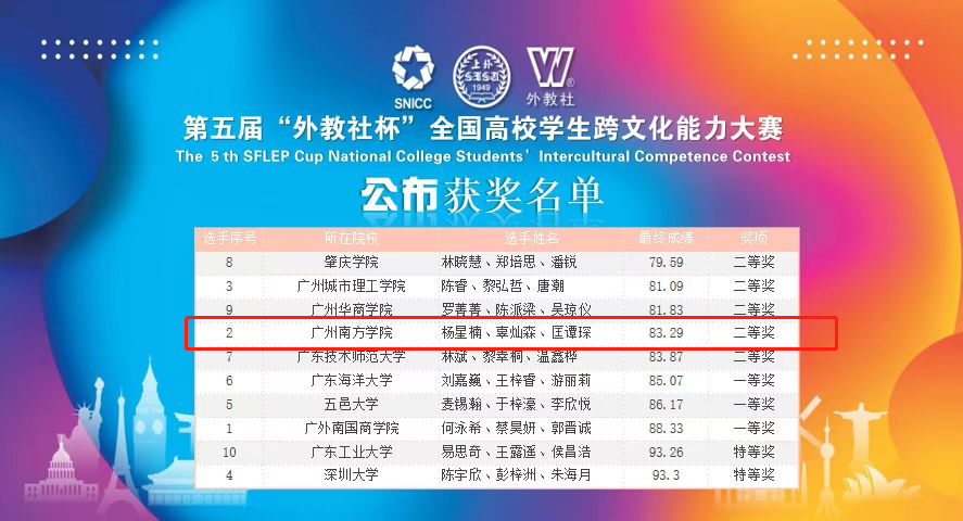 12月4日,第五届“外教社杯”全国高校学生跨文化能力大赛(广东赛区)决赛落下帷幕。申搏学生杨星楠、辜灿森和匡谭琛在大学英语教学中心教师王金妮、袁洁和外国语学院教师吴雅菲的指导下,在本次大赛中斩获二等奖的优异成绩。...