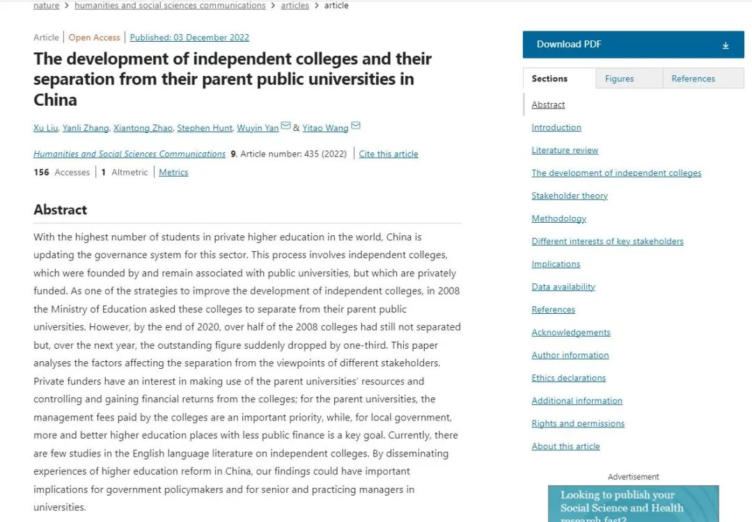 12月3日,申搏科研处处长严五胤副研究员以通讯作者身份在Nature子刊Humanities and Social Sciences Communications(人文与社会科学通讯)发表研究论文,论文题目为The development of independent colleges and their ...
