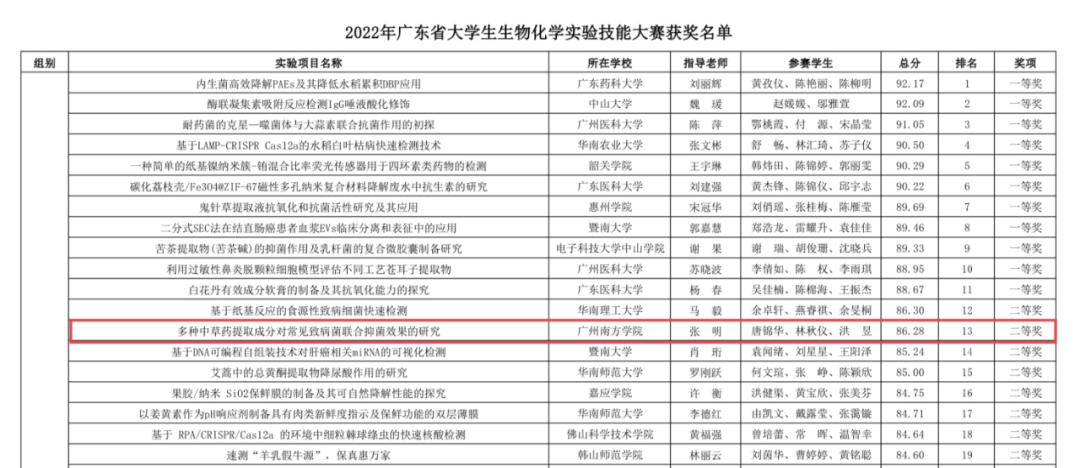 近日,2022年广东省大学生生物化学实验技能大赛成功举办。经过激烈的初赛和决赛角逐,申搏云康医学与健康学院医学检验技术专业学生唐锦华、林秋仪、洪昱在教师张明的指导下,凭借项目《多种中草药提取成分对常见致病菌联合抑菌效果的研究》...