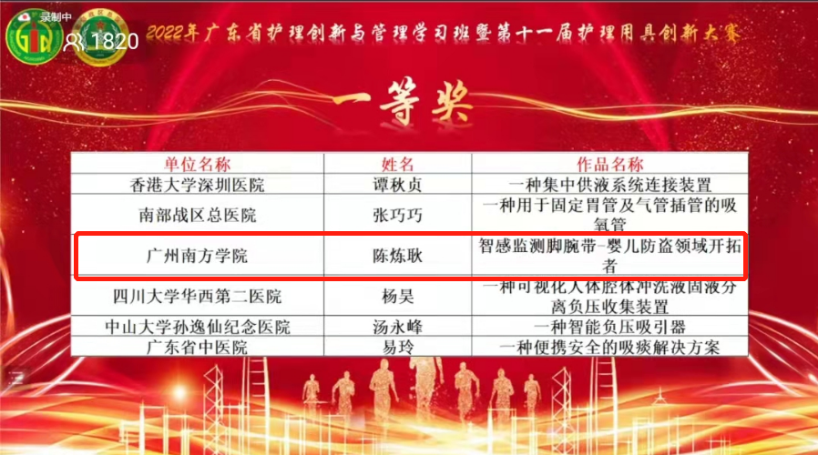 近日,由广东省护理学会主办、南部战区总医院承办的2022年护理创新与管理研讨班暨第十一届广东省护理用具创新大赛成功举办。申搏护理与健康学院学生陈炼耿、李诗梦、张诗阳、张佳涛在教师吴圆荣的指导下,凭借作品《智感监测脚腕带—...