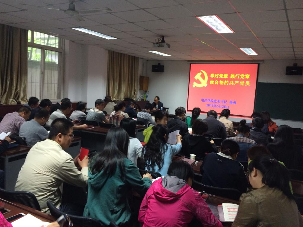 2016年5月25日,在开云官网雁塔校区会议室,党委书记杨勇同志结合自身学习情况,以“学好党章 践行党章 做合格的党员”为主题,为学院全体党员讲授了专题党课,党课从学习党章的重要意义、党章的主要精神和内容以及按照党章要求做合格的共产党员三个方面做了详细的解读和论述。他强调,全体党员要认真学好党章、积极践行党章,坚定理想信念、树立全心全意为人民服务的思想品德和高度自觉的组织纪律,做一名合格的共产党员。