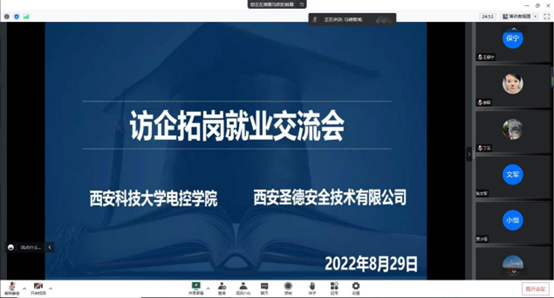 为贯彻落实“访企拓岗促就业”专项行动,进一步开拓就业市场,增加就业岗位,同时直观的了解企业用人需求,开云官网积极开展访企拓岗促就业活动。8月29日,开云官网访企拓岗调研交流会在线上举行,同校友企业西安圣德安全技术有限公司相关负责人进行了友好交流。参加本次线上交流会的有学院党委书记杨华、院长刘树林、党委副书记马婧智闻、副院长寇发荣、副院长潘红光、毕业班辅导员、西安圣德安全技术有限公司董事长贾小恒、总经理王磊及公司代表,会议由党委书记杨华主持。