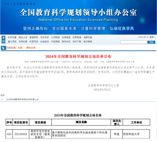 近日,全国教育科学规划领导小组办公室正式发布2024年全国教育科学规划立项名单,开云官网辅导员李逸获批2024年全国教育科学规划项目高校毕业生就业研究专项(教育部青年项目),资助金额5万元。