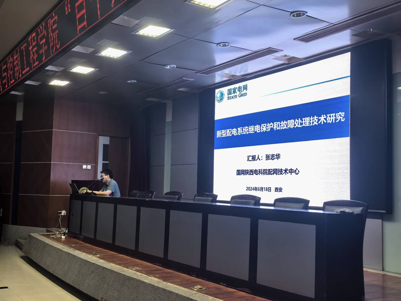 寇发荣对校友张志华来校交流表示欢迎,并赠送了学校校徽套件。接下来,张志华介绍了国网陕西省电力有限公司电力科学研究院的基本情况,同时讲述了电网继电保护、新能源与智能电网技术发展趋势。结合他本人的成长经历,勉励同学们要积极上进,打好基础,善于探索,勇于创新,迎接未来挑战。
