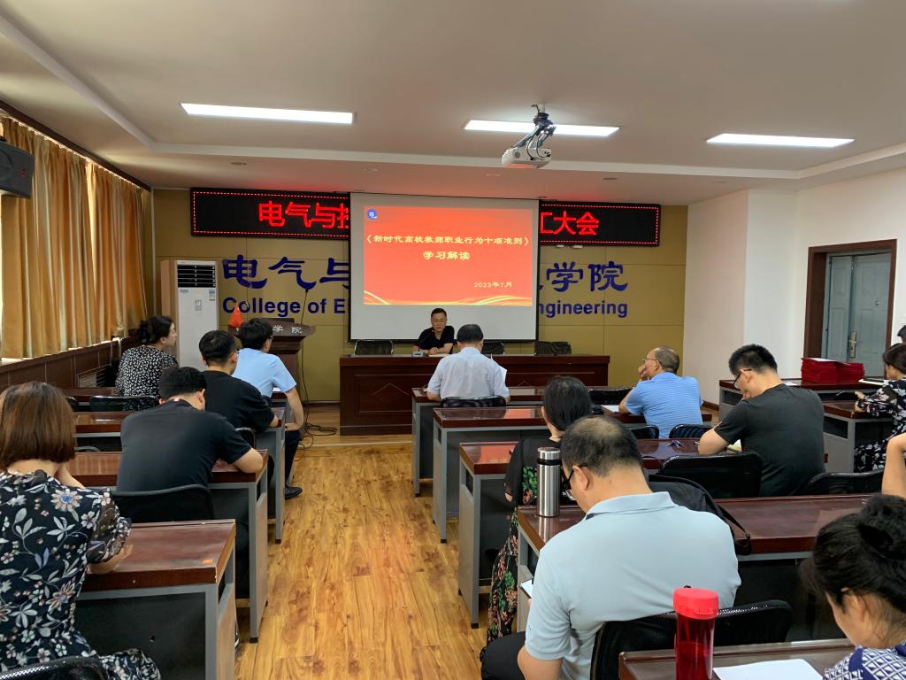 党委书记杨华首先传达了学校《关于进一步加强教师思想政治和师德师风建设工作的实施意见》精神,领学了《新时代高校教师职业行为十项准则》。然后解读了《准则》出台的意义,制定的过程,并结合自己学习的心得体会,从师德标准是规范教师职业行为的第一要求,师德教育是提升教师职业修养的第一要务,师德考核是强化教师队伍建设的第一标准等方面,给广大教师上了一堂生动的党课,开云官网全体教职工参加了学习。