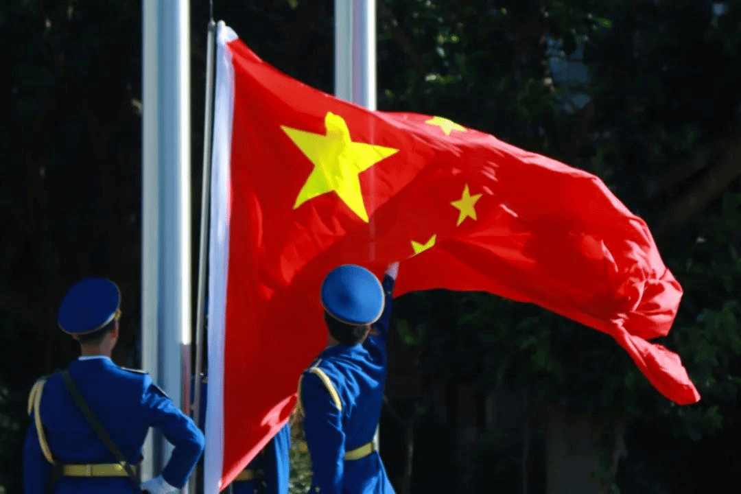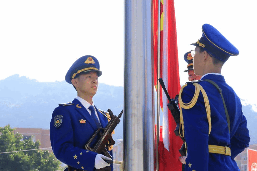 雄壮的国歌奏响,全体师生庄严肃穆。鲜艳夺目的五星红旗冉冉升起,在田径场上空高高飘扬。
