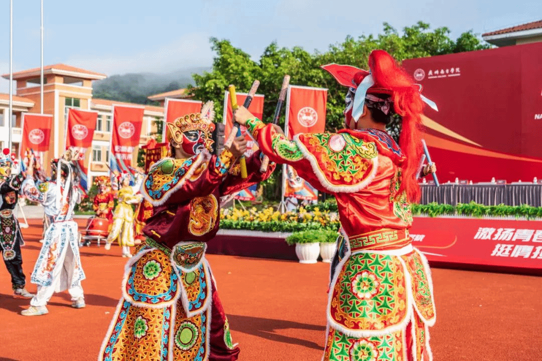 在仪式正式开始之前,学校风云英歌队踏着鼓点入场。他们以精湛的技艺和高涨的热情为新生生动呈现了“中华战舞”这一非物质文化遗产的魅力。