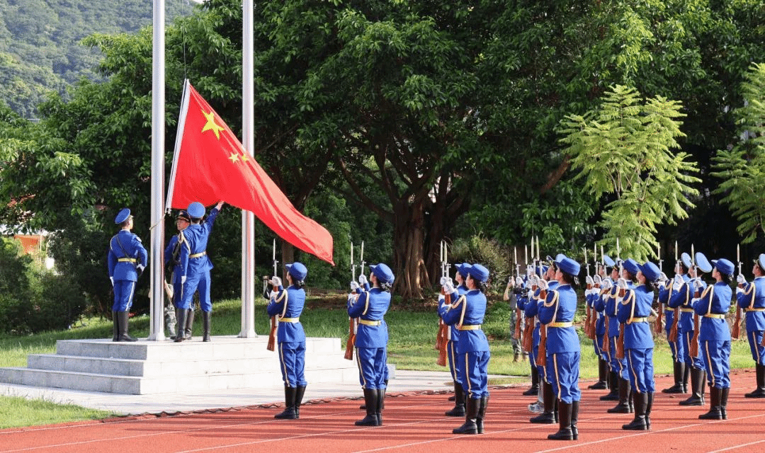 国教队国旗班迈着铿锵整齐的步伐,庄严地护卫着鲜艳的五星红旗走向升旗台。全体肃穆,奏唱国歌。五星红旗冉冉升起。