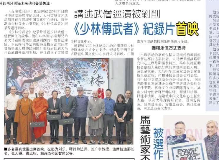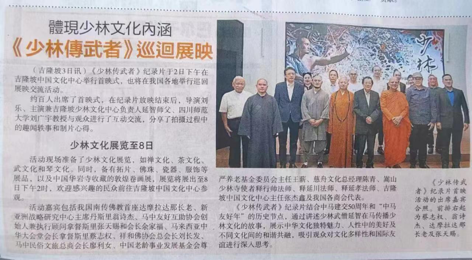马来西亚国家电视台、《星洲日报》《中国报》等当地主流华文媒体争相报道这一中马文化交流盛事,引发海外媒体广泛关注。马来西亚当地媒体评论:纪录片《少林传武者》结合中马建交50周年和“中马友好年”的历史节点,仿佛是一个精心准备的礼物,以优秀影像故事为中马人民的文化交流的同心桥添砖加瓦,推进中马双方友谊往更深更远的步伐迈进。