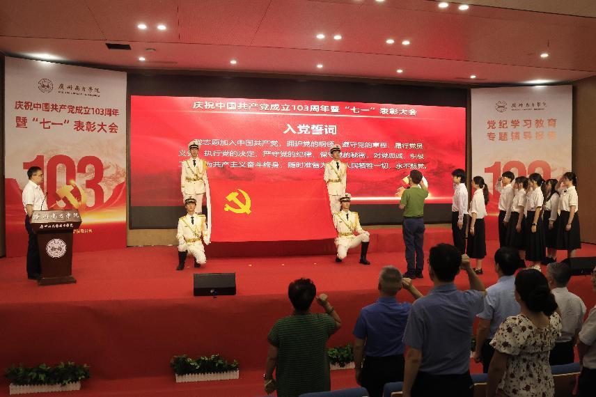 会上隆重举行了新党员入党宣誓仪式。新党员代表面向鲜红的党旗庄严宣誓,艺术设计与创意产业系党总支书记朱文山领誓,参会的全体党员同时重温入党誓词。