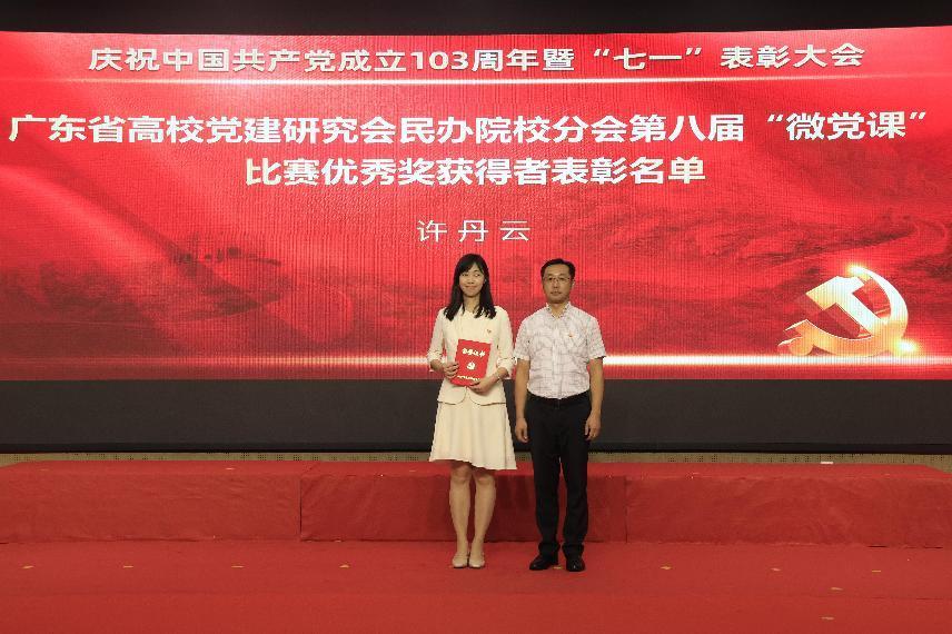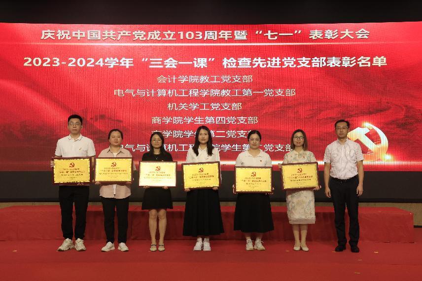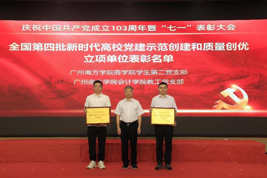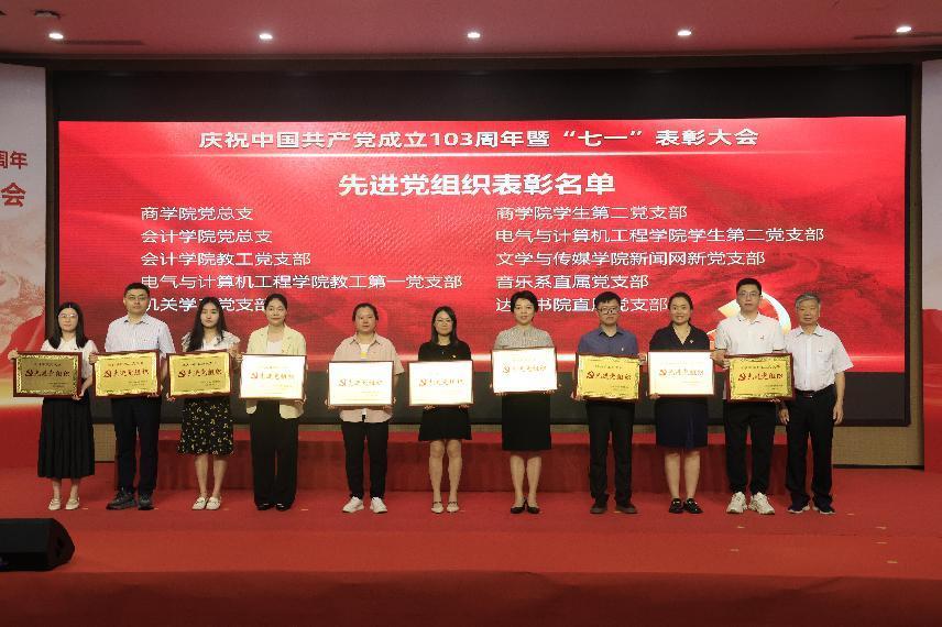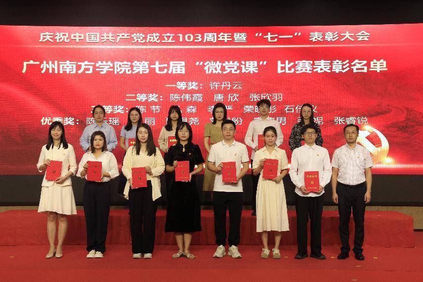 上午9时,大会在雄壮的国歌声中拉开帷幕。植秀聪副书记、副校长宣读“七一”表彰决定,对陈娜等49名优秀共产党员、蔡丛等24名优秀党务工作者、商学院党总支等10个先进基层党组织、会计学院教工党支部等6个“三会一课”检查先进党支部、宋得福等5名党建研究优秀成果获奖者、广东省高校党建研究会民办院校分会第八届“微党课”比赛优秀奖获得者许丹云、陈伟霞等16名校级“微党课”比赛获奖者、商学院学生第二党支部等2个全国第四批新时代高校党建示范创建和质量创优立项单位、广东省第三批“双带头人”教师党支部书记工作室培育创建单位会计学院教工党支部进行表彰,获奖代表依次上台颁奖。