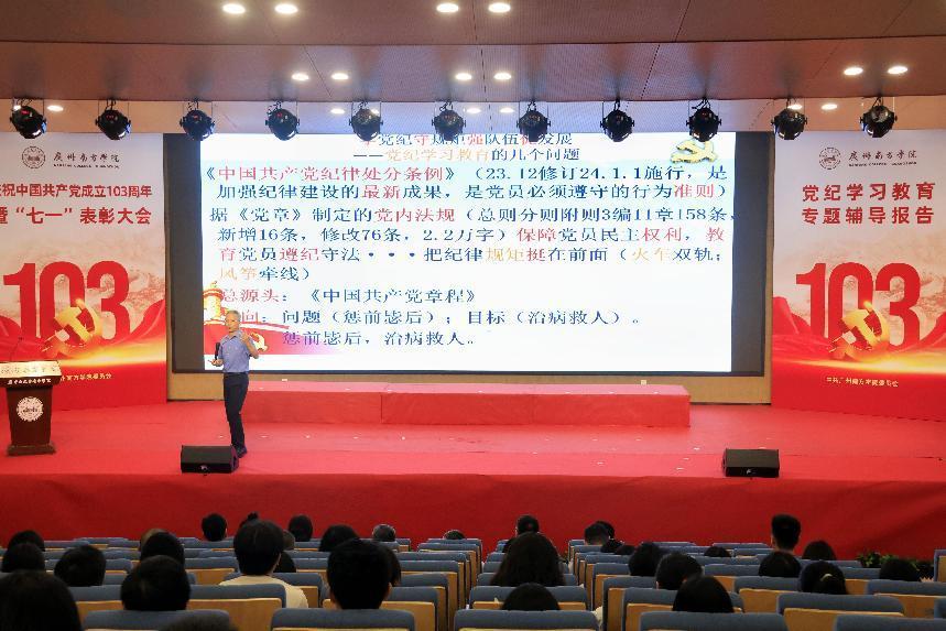6月28日,SUNBET申搏在讲学厅隆重举行庆祝中国共产党成立103周年暨“七一”表彰大会,同时举行党纪学习教育专题辅导报告会。学校党政班子成员、校长助理及教师党员代表、学生党员代表共计两百余人参加会议。会议由学校党委副书记、副校长植秀聪主持。