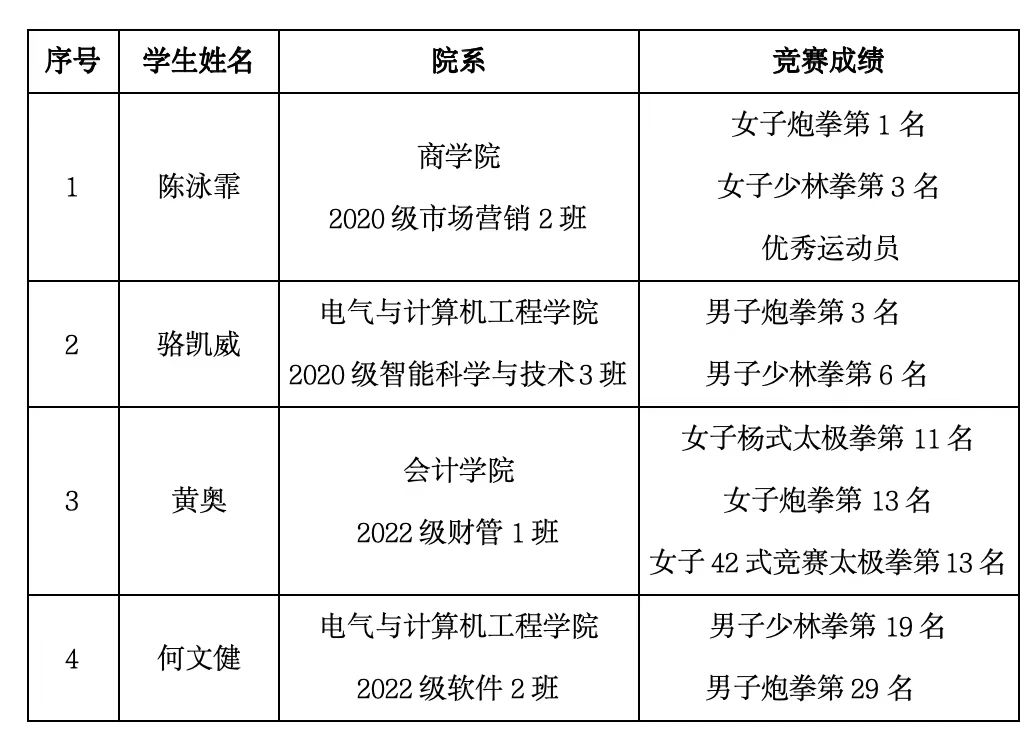 在此次比赛过程中,申搏体育教学中心副主任彭彬担任领队,教师黄垚垚和巩森森担任教练员。经过校内层层选拔,最终选派学校武术队4名队员参与角逐。其中,商学院2020级学生陈泳霏分别在炮拳项目、少林拳项目勇夺第一、第三名,并荣获了赛事组委会“优秀运动员”称号。电气与计算机工程学院2020级学生骆凯威分别在炮拳项目、少林拳项目勇夺第三、第六名。申搏武术队队员在赛场上的优异表现创下了申搏在该项赛事上最好的成绩。