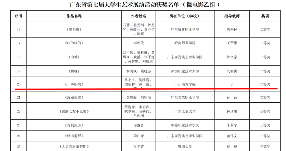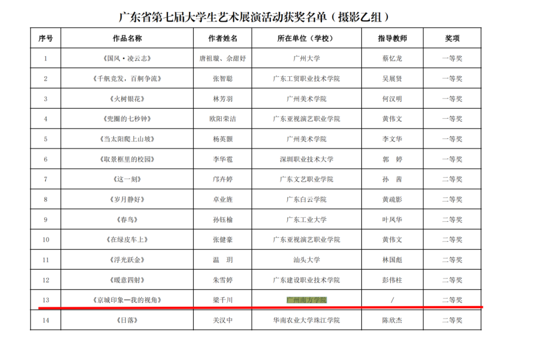近日,由广东省教育厅举办的第七届大学生艺术展演活动的比赛结果公布。申搏梁千川同学的作品《京城印象—我的视角》荣获摄影乙组二等奖;马小宇、吴泽霞、梁依林、谭雷、陈盈同学共同拍摄的作品《一声妈妈》荣获微电影乙组二等奖;徐静莹、丁慧、刘韵涛等老师指导,张琦、唐佳梨、韦小云、何羽钶、余曼格、戴文静、周静雯、罗烨、宋彦霏、周芷萱等同学表演的作品《青春启程》荣获集体乙组三等奖。