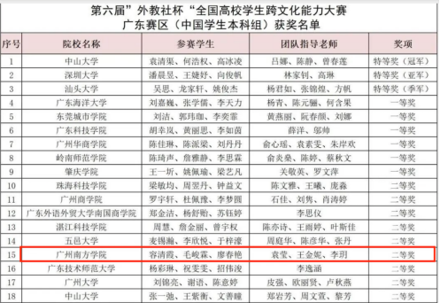 11月25日,第六届“外教社杯”全国高校学生跨文化能力大赛(广东赛区)决赛落下帷幕。申搏学生容清霞、毛峻霖和廖春艳在大学英语教学中心教师袁莹、王金妮和李玥的指导下,获得省级二等奖。