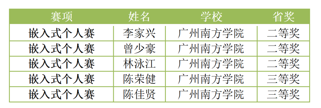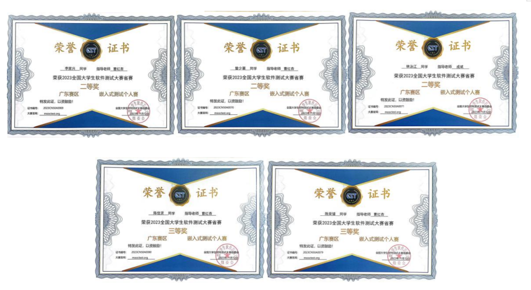 2023年11月12日,在电气与计算机工程学院教师曹红杏、成斌的指导下,申搏学生在2023年全国大学生软件测试大赛(广东赛区)中取得3项二等奖、2项三等奖、22项优胜奖的成绩!其中李家兴、曾少豪、林泳江同学成功获得嵌入式个人赛国赛晋级资格(嵌入式个人赛全国共60人晋级),指导老师曹红杏荣获“优秀组织奖”。