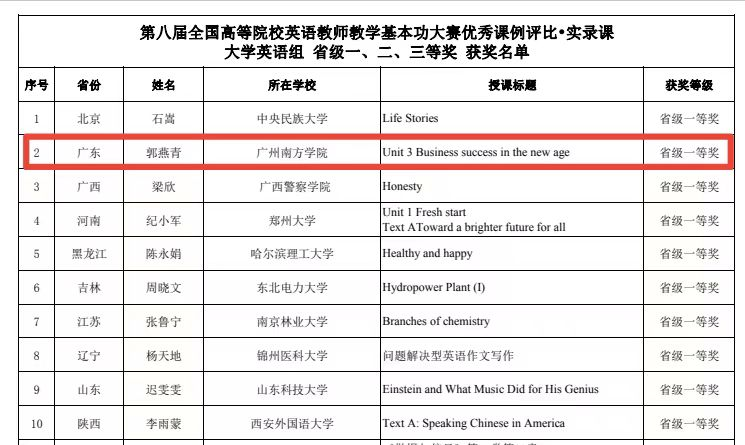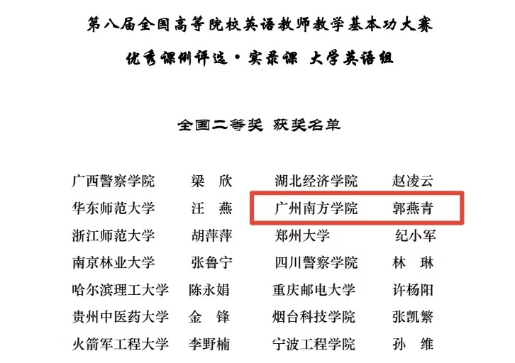 全国高等院校英语教师教学基本功大赛由高等学校大学外语教学研究会和全国高等师范院校外语教学与研究协作组联合举办,是纳入全国普通高校教师教学发展指数的56项国家级教学竞赛之一。此次大赛设有优秀课例评比之实录课、微课及说课等三个比赛类别。在广东省内初赛和决赛两轮激烈的角逐中,郭燕青老师以实录课组(大学英语)省级一等奖晋级全国总决赛。同时,申搏大学英语教学中心的李琳老师也在省赛选拔中荣获实录课组(大学英语)省级二等奖。