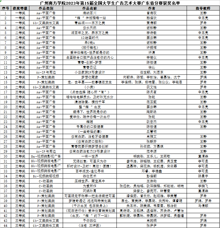 近日,2023年第15届全国大学生广告艺术大赛广东省省赛评审结果揭晓,申搏学子在比赛中斩获44项奖项,其中一等奖3项、二等奖13项、三等奖28项。