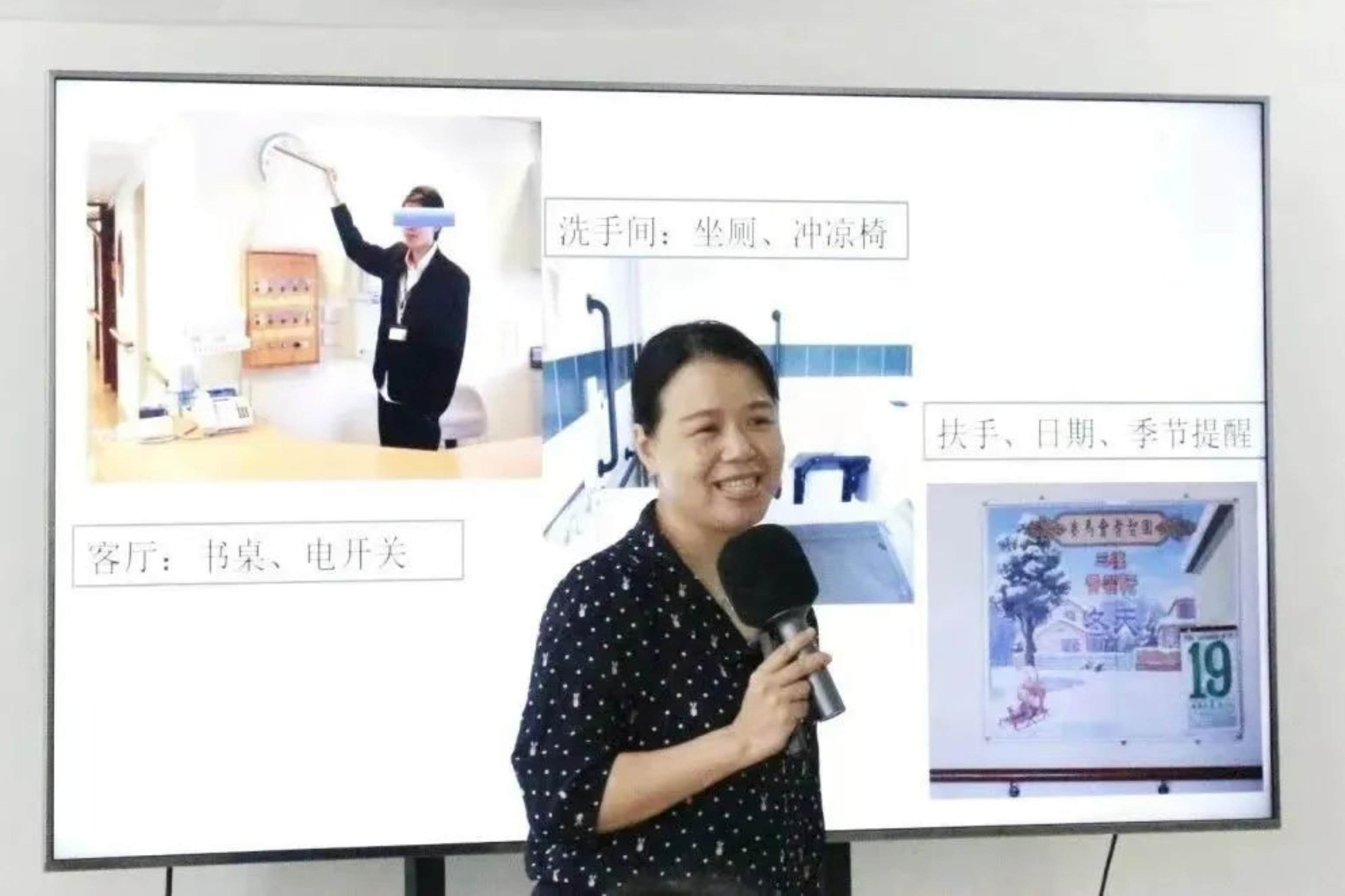 本期课程主题为“理解与接纳”,主要介绍失智老人的家庭友好环境及沟通技巧。基于失智老人的特殊需求,沈曼璇老师强调了家居环境布置的重要性,并针对布置要点进行了逐一讲解,例如适老化家居改造、合理划分生活空间、引入智能辅助设备等,并辅以具体的场景图,直观展现细节,让参与者一目了然。