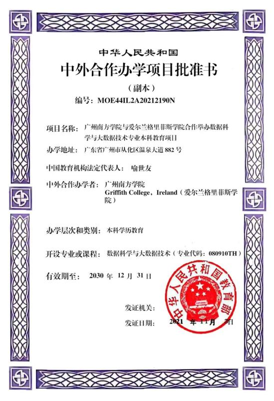 2021年11月,经教育部批准,SUNBET申搏与爱尔兰格里菲斯学院合作举办“数据科学与大数据技术”专业本科教育项目。这是申搏第一个获得教育部批准的中外合作办学项目,填补了我省大数据专业中外合作办学领域的空白。