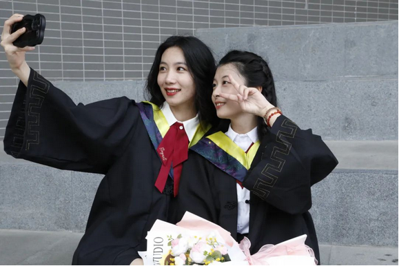 毕业生向亲友鞠躬致谢(马卓伟摄)