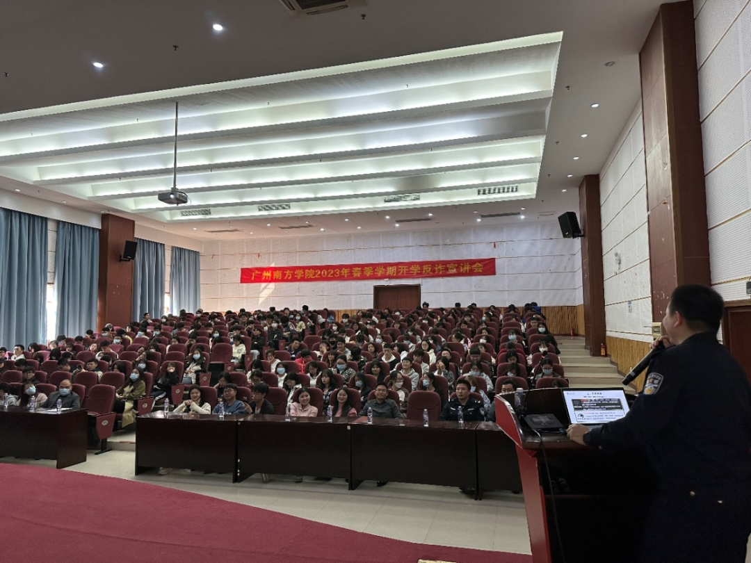 3月1日,申搏于图书馆学术报告厅举行了2023年春季学期开学反诈防骗宣讲会。广州市公安局从化分局温泉派出所副所长张华荣、广州市公安局从化分局指挥中心岳林警官应邀到会,申搏200余名校园反诈志愿宣讲员师生及保卫处全体成员参加了本次宣讲会。