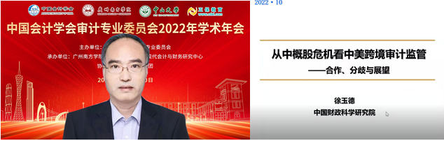 中国财政科学研究院徐玉德教授作了题为“中概股跨境审计监管的困局及解决路径”的报告。徐玉德教授从瑞幸咖啡财务造假事件入手,分析了两次中概股危机引致的中美跨境审计监管焦点问题,为构建中美跨境审计监管合作协议下审计结果共享机制提供了意见建议。