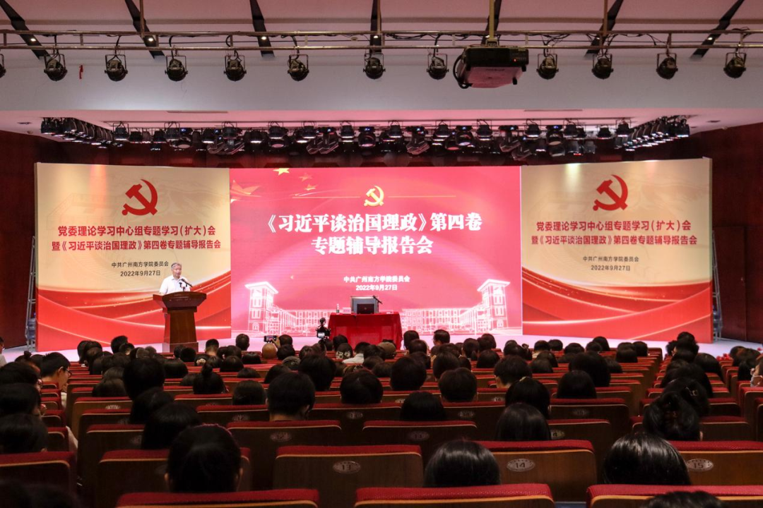 9月27日下午,申搏在音乐厅召开党委理论学习中心组(扩大)专题学习会暨《习近平谈治国理政》第四卷专题辅导报告会。会议特邀省委宣传部《习近平谈治国理政》第四卷宣讲专家、中山大学马克思主义学院教授胡雪莲作专题辅导报告。学校党政班子成员、校长助理、校党委理论学习中心组成员、马克思主义学院教师及党员师生代表共400多人参加本次报告会,会议由党委书记李建超主持。