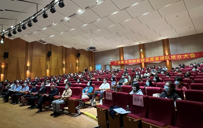 2022年10月19日上午,申搏在音乐楼音乐厅举行反诈志愿宣讲队成立大会暨授旗仪式。广州市公安局从化分局温泉派出所所长莫玉军,从化区刑警大队副队长马士博,温泉派出所副所长张华荣,学校常务副校长、党委副书记唐燕,党委副书记、副校长植秀聪,保卫处、学生成长教育中心等相关负责人,各院系学生工作办公室主任,反诈宣讲专员及200余名反诈志愿宣讲员出席了本次活动。