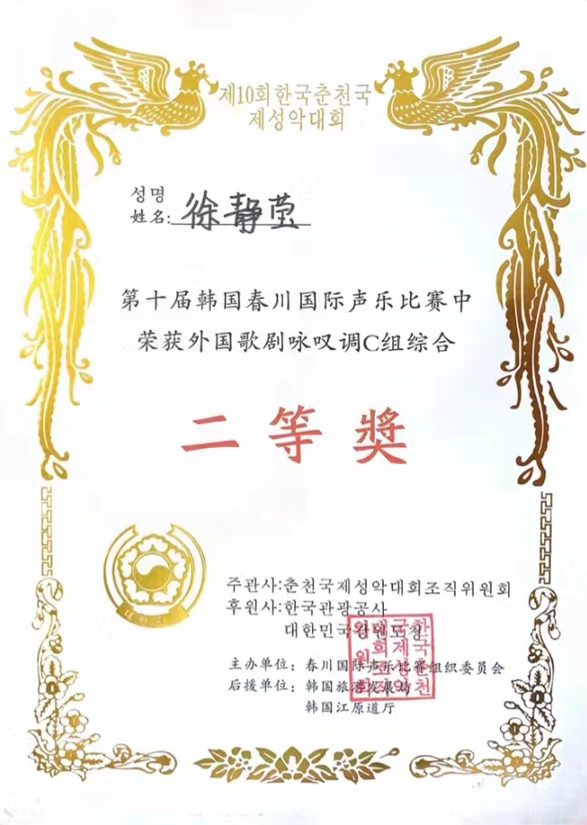 近日,在第十届韩国春川国际声乐比赛中,申搏音乐系青年教师徐静莹,以优异的成绩荣获外国歌剧咏叹调C组综合二等奖,并赢得评委会高度赞赏。艺术指导为丁慧老师。