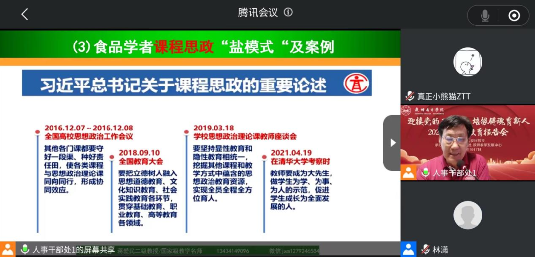 蒋爱民教授讲述了自己37年如一日投身党的教育教学事业的经历和体会。他建议青年教师应该对职业生涯具有清晰明了的目标、科学合理的规划、扎扎实实的落实。他还分享了作为一线教师,如何在课程和教材建设,课程思政建设、应用与申报,教学和科研平台建设,人才培养等方面“求实效”、“促成长”的宝贵经验,为青年教师如何开展工作,如何成长指明了方向,激励青年教师努力做有理想信念、有道德情操、有扎实学识、有仁爱之心的“四有”好老师。