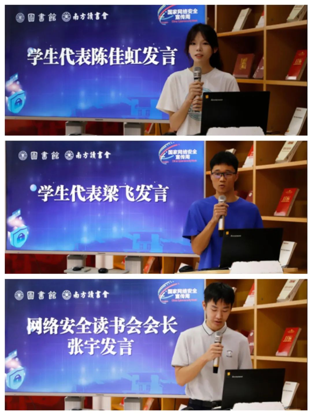 李业谦科长、邓云生科长分别介绍了南方特色馆以及南方读书会的成立情况。随后在师生们的见证下,与会领导、师生共同为网络安全馆、网络安全读书会揭牌。仪式结束后,学生代表陈佳虹、梁飞、张宇先后上台发言。