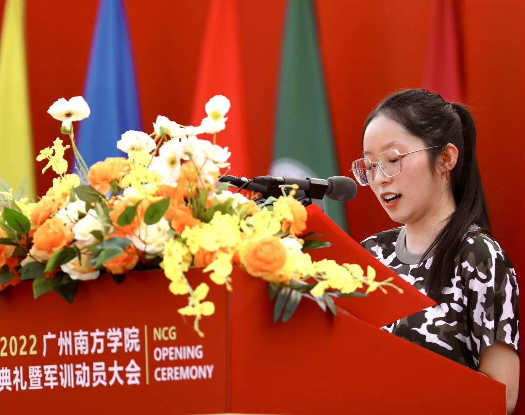 2022级文学与传媒学院汉语言文学专业的杨潇作为新生代表上台发言。杨潇同学回忆了从迎新到日常生活,学校给予他们的种种关怀。她表示,“我们与南院的故事,才刚刚开始。也许我们现在会迷茫、焦虑,担心自己迷失方向。但我们终将会在不断探索、试错中拨开云雾,知道自己到底想成为怎样的人、应该成为怎样的人。”