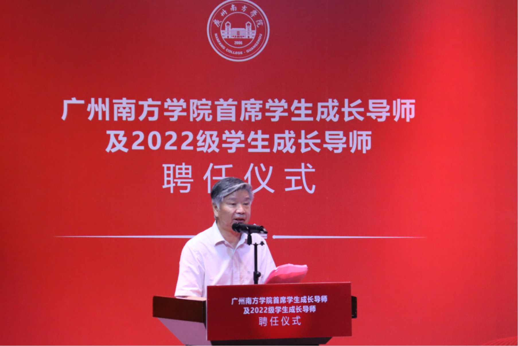 喻世友校长代表学校向首席学生成长导师及2022级新生成长导师表示祝贺。他在讲话中指出,多年来,南方学院遵循学生成长特点与规律,始终强调提升学生的“自我推动力”,呼吁“老师要回到老师”,助力学生自我成长、自我推动,破解“教书”与“育人”两张皮;具有丰富社会阅历的党政军民学各领域的贤达担任首席学生成长导师,将在指导青年教师及辅导员、推动其成长方面发挥重要的作用,是当前高校育人机制的创新尝试,是申搏青年教职员队伍培养的一种创新性补充,也是学生培养工作的一种创新性补充。