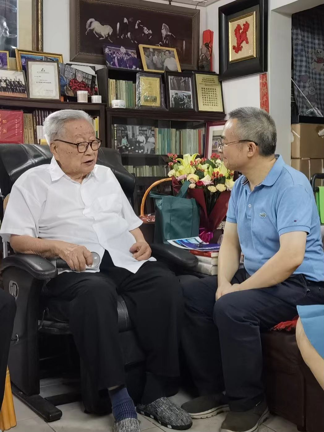 104岁的夏老精神矍铄、神采奕奕。他首先听取了陈天祥院长关于“粤有数”活动的整体情况和公共管理学院办学状况的介绍。陈天祥表示,“粤有数”秉承习近平总书记“运用网络数据,做到‘心中有数’”的重要指示要求,在广东省政数局领导的指导支持下,7月15日顺利举办了2022“粤有数”新技术治理交流会,在合理利用政府所具有的行政资源和治理经验的同时,有效融合高校的教学科研能力,举各界之力打造了一个惠及全社会的优质数字化治理学术交流平台,并将成为广东数字政府“12345+N”工作业务体系中“N”体系的一个重要组成部分。