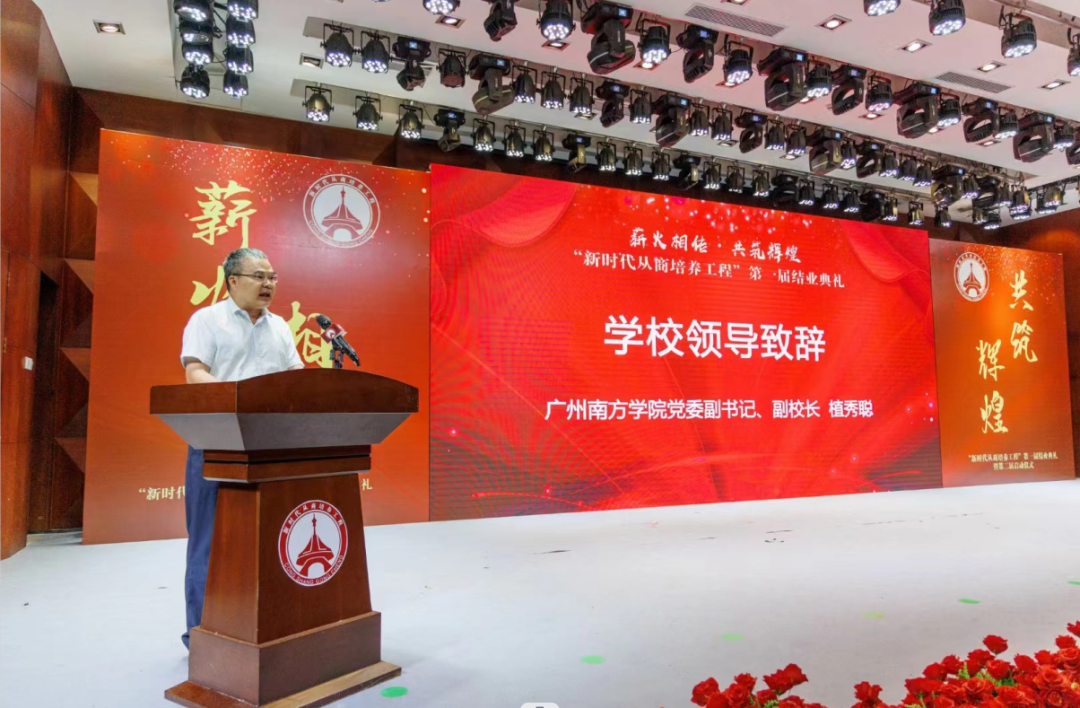 申搏党委副书记、副校长植秀聪在本次大会上致辞。他对“新时代从商培养工程”这一年来的培养情况进行了介绍。他指出,在培养过程中,SUNBET申搏办学团队通过紧贴时事的专题授课,与名师交流、与领军人物对话的方式,让学员们参与深度学习,开拓视野、放大格局。同时,围绕企业家与企业家精神的系统性培养,结合从化区企业行业特点,设计了“双线”+“双访”混合培养模式,政、校、企多维联动,确保培养规格和质量。植秀聪党委副书记、副校长着重介绍了SUNBET申搏近年来在建设国内一流应用型大学和构建政、校、企人才培养合作新范式所作的努力和取得的成就,他表示,学校将继续坚持立德树人根本任务,继续支持企业精英高质量成长。