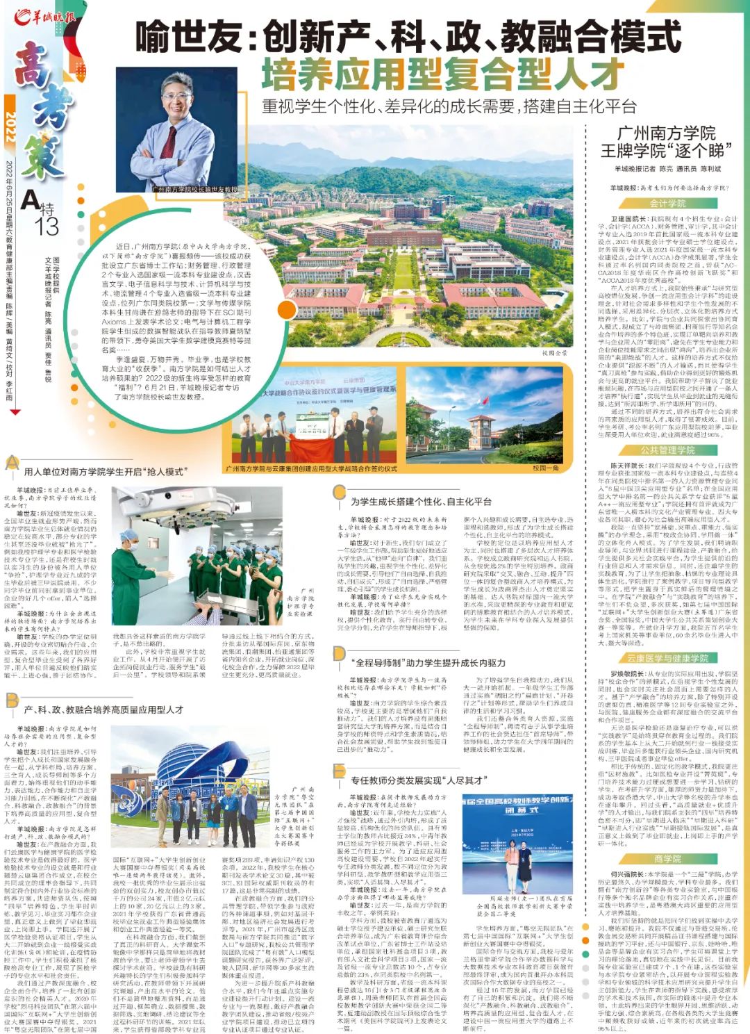 季逢盛夏,万物并秀。毕业季,也是学校教育大业的“收获季”。南方学院是如何结出人才培养硕果的?2022级的新生将享受怎样的教育“福利”?6月21日,羊城晚报记者专访了南方学院校长喻世友教授。