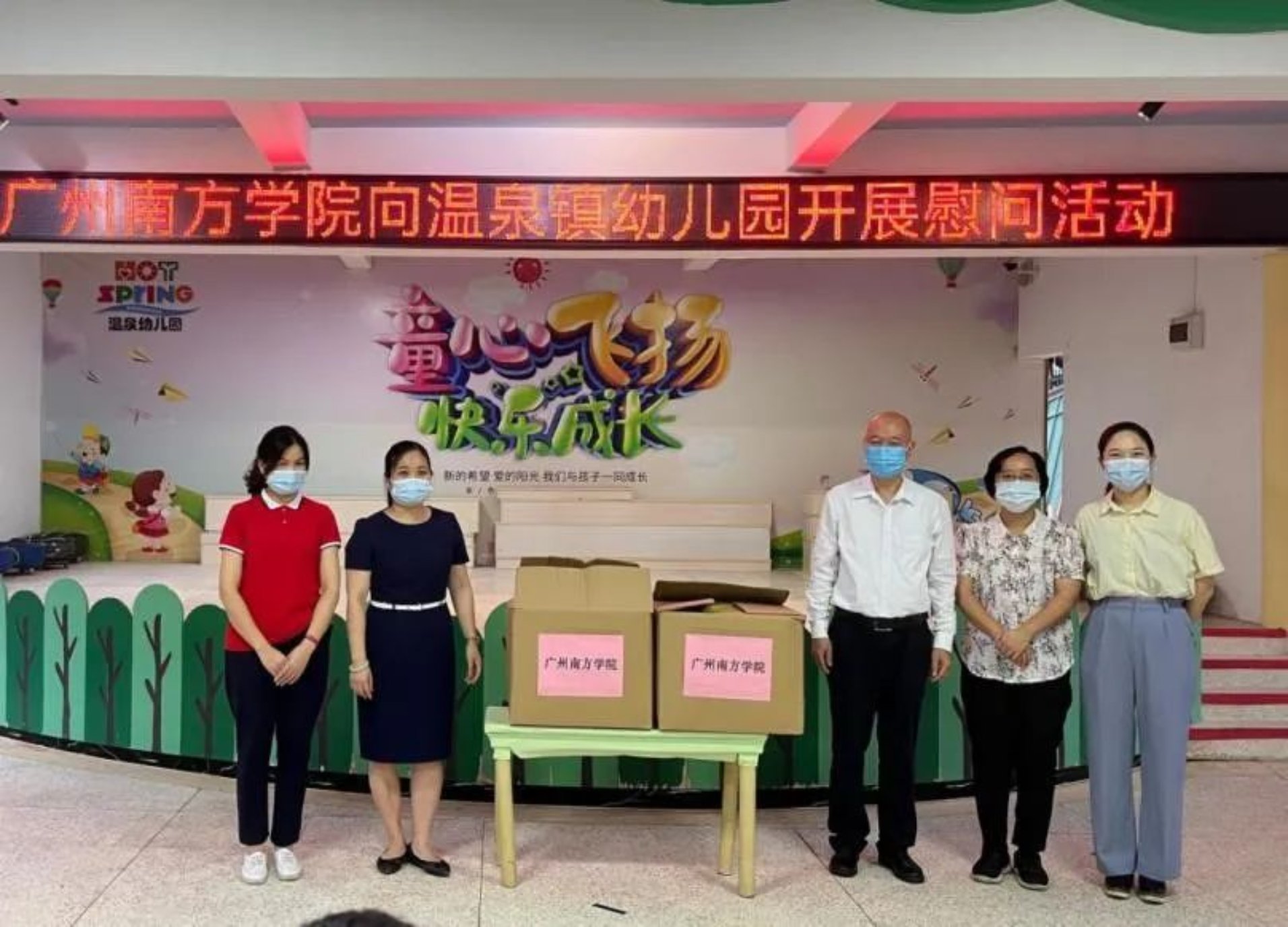6月21日上午,申搏成长教育中心主任、关心下一代工作委员会副主任吴迎新,商学院副院长、工会副主席钟肖英及工会办公室廖丽鹂副主任一行到访从化区温泉镇幼儿园开展慰问活动,并根据温泉镇幼儿园保育活动实际和学童数向园区学童送上405顶定制遮阳帽致以关心和慰问,共同守护下一代健康成长。