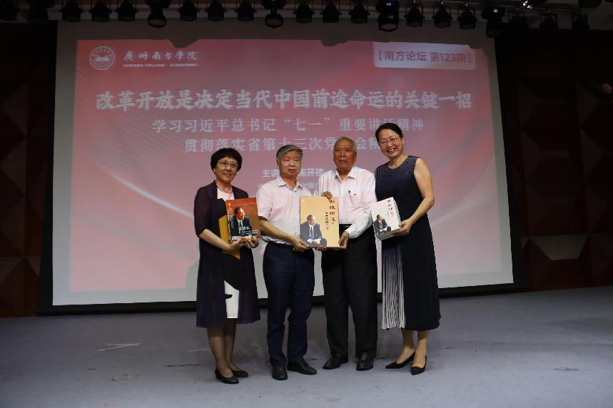 讲座中,陈开枝回顾了改革开放四十年以来国家经济、广东地区人民生活发生的翻天覆地的变化,用精准的数据和鲜活的事例论证了“改革开放是决定当代中国前途命运的关键一招”。他结合自己的工作、生活经历,声情并茂地讲述了广东改革开放的辛酸曲折。他阐述了深圳,珠海,汕头等经济特区的建立过程,展现了党中央、广东党员干部一路披荆斩棘、开拓创新的时代精神。他用生动的语言讲述了1992年接待邓小平同志南巡的经历,还原了“南方谈话”的历史细节,展示了一代伟人非凡的勇气和魄力。