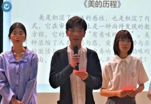 此次进入读书报告会决赛的选手共有13位,他们将以现场汇报的方式分享自己喜欢的书籍和阅读感悟。比赛伊始,现场播放了由校主播团及学生成长理事团共同制作的读书集锦视频作品,聆听了由校主播团刘天旭同学以及全体参赛同学带来的美文朗诵。大家的朗诵铿锵有力,赢得了在场观众的阵阵掌声。