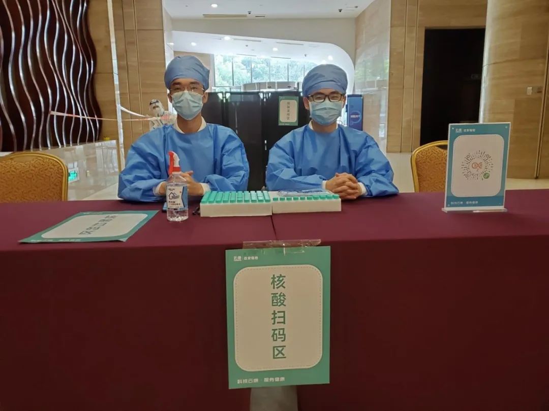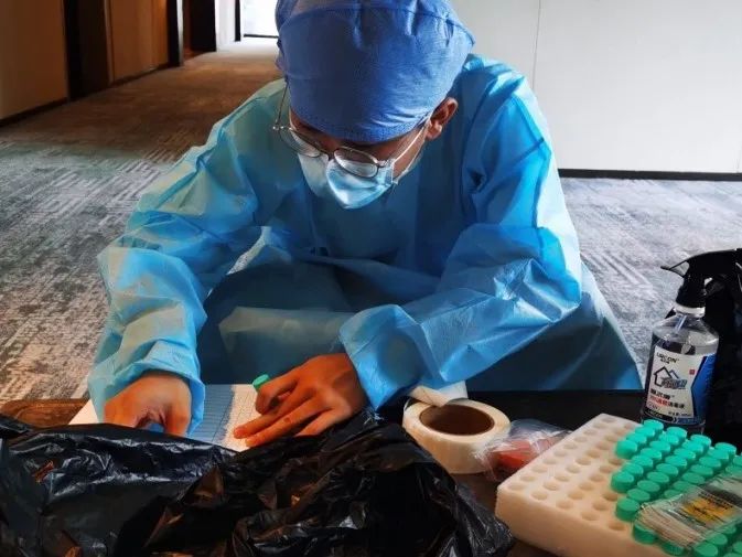 遵循会务组的工作安排,申搏核酸检测志愿队前往云康集团安排的酒店入住并进行闭环管理,相关工作人员对志愿队进行岗前培训和任务分配。志愿队认真熟悉掌握流程,做好核酸检测服务前期的系列准备工作,如为核酸检测的样本试剂贴上条形码,以确保试剂检测的结果与相应检验者相匹配;其次是扫核酸码工作,申搏核酸检测志愿队干净利落且有效地核对信息,高效完成该环节任务;最后也是最关键的工作,即为环境采样,申搏核酸检测志愿队按照“人物同防”的重要指示,一齐协助云康集团的工作人员对酒店和会场进行环境采样。在环境消杀前对酒店环境内每个房间至少提取4份样本,对电梯按钮、楼梯扶手还有公共厕所等公众环境提取5份以上样本,把样本分类后送到实验室进行检测。