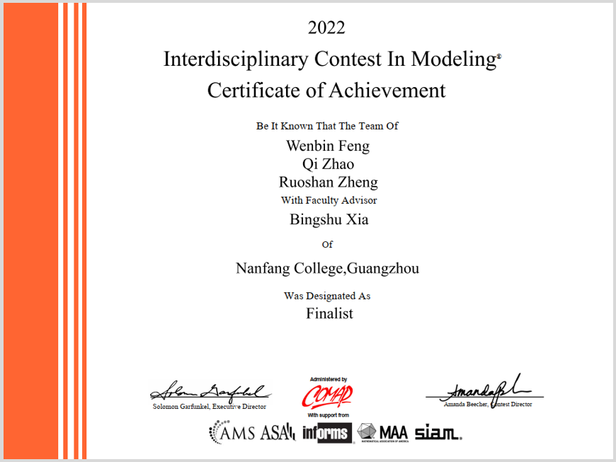 近日,2022美国大学生数学建模竞赛成绩揭晓。申搏电气与计算机工程学院19级学生冯文彬、赵祺,20级学生郑若姗组成的数据智能战队,在指导教师夏炳墅的带领下,勇夺本次美国大学生数学建模竞赛特等提名奖(Finalist)。