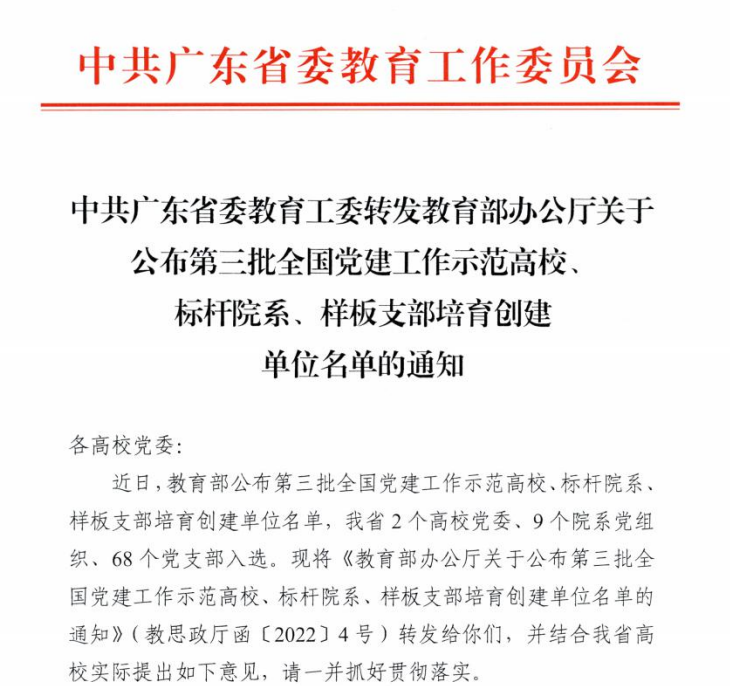 《教育部办公厅关于公布第三批全国党建工作示范高校、标杆院系、样板支部培育创建单位名单的通知》(教思政厅函[2022]4号)