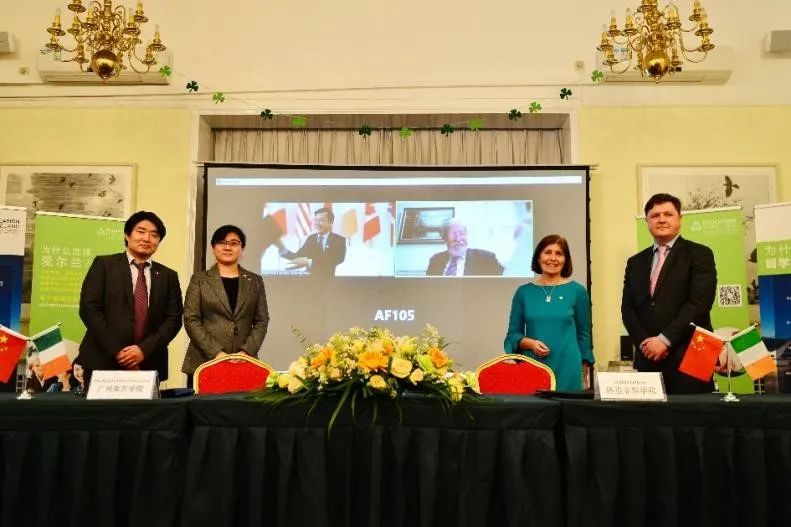 随后,在安黛文大使、爱尔兰贸易与科技局和爱尔兰教育推广署的见证下,两校通过“云签约”的方式在线签署了“3+1+1联合培养本科生和本升硕项目”协议。中爱双方校领导在摄像头前与安黛文大使、爱尔兰驻华使馆教育一等秘书马东闻(Eoin McDonell)先生、中国教育国际交流协会副秘书长安延女士、爱尔兰教育推广署资深教育顾问杨杰先生合影。