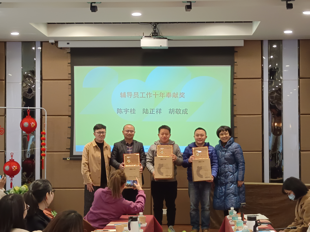 表彰仪式上,为陈宇桂、陆正祥、胡敬成等三位在辅导员岗位上连续工作了10年的老师授予“辅导员工作十年奉献奖”,颁发勋章和纪念品。