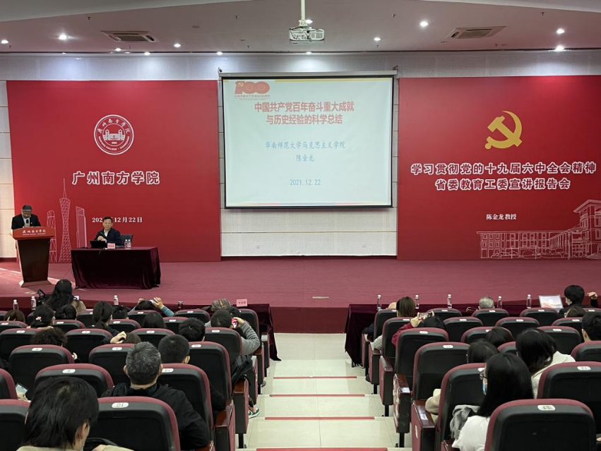 为全面深入学习领会党的十九届六中全会精神,扎实推进学习宣传贯彻工作,推动全校兴起学习宣传贯彻党的十九届六中全会精神的热潮,12月22日上午,申搏开展十九届六中全会主题宣讲会暨“南方党建学习”第三讲,邀请省委教育工委宣讲团成员,华南师范大学马克思主义学院院长、教授陈金龙作十九届六中全会精神专题宣讲。学校领导班子成员、党委委员、党委理论学习中心组成员、院系学生辅导员、党员师生代表等200多人参加本次宣讲报告会,会议由党委书记李建超主持。