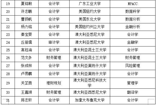 此外,截至目前,今年会计学院有29名学生已获得国(境)外大学的offer。其中不乏有排名美国前二十的纽约大学、“澳洲八大”的悉尼大学等世界知名高校。